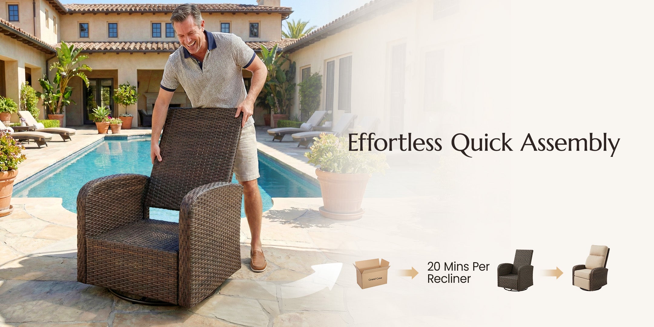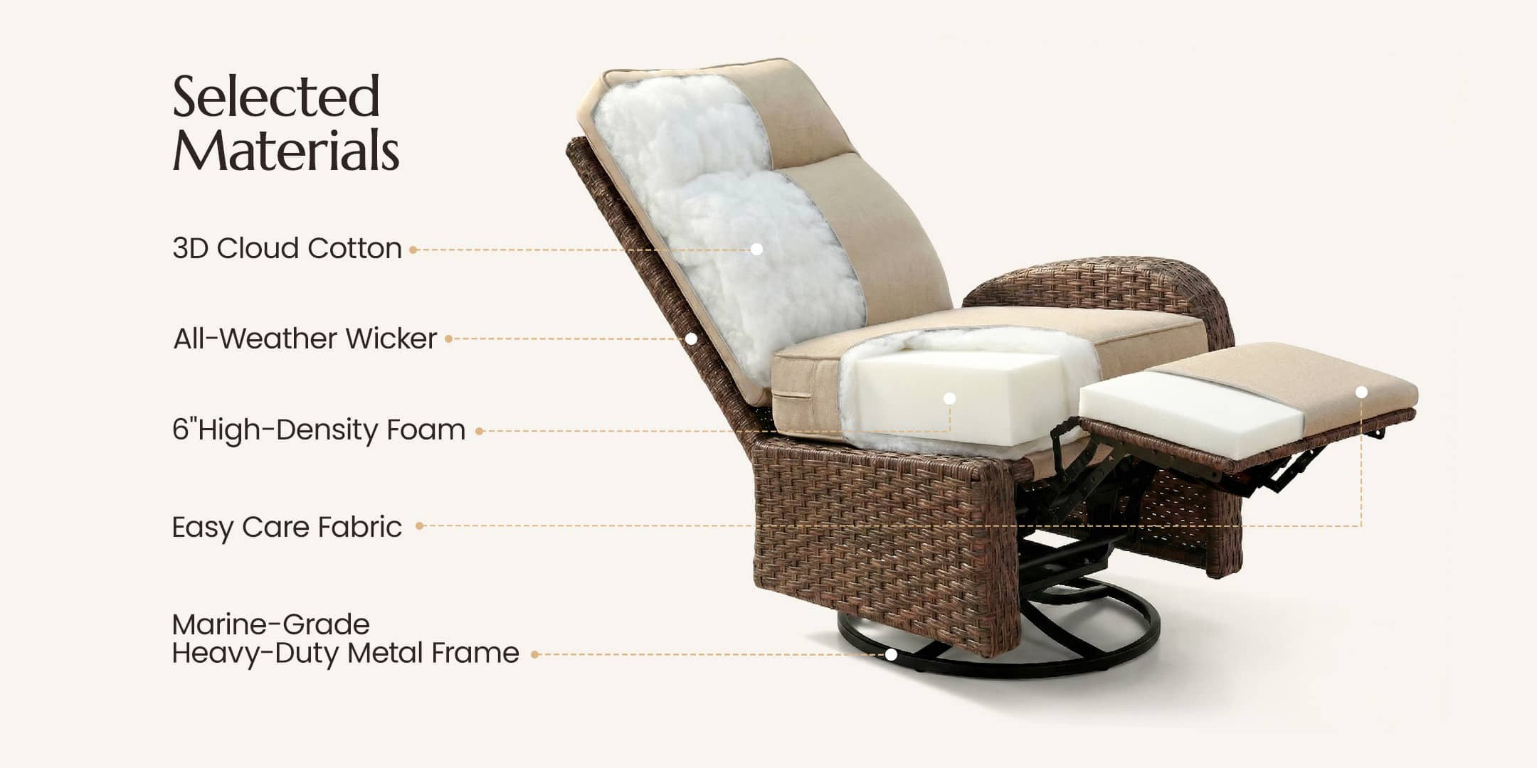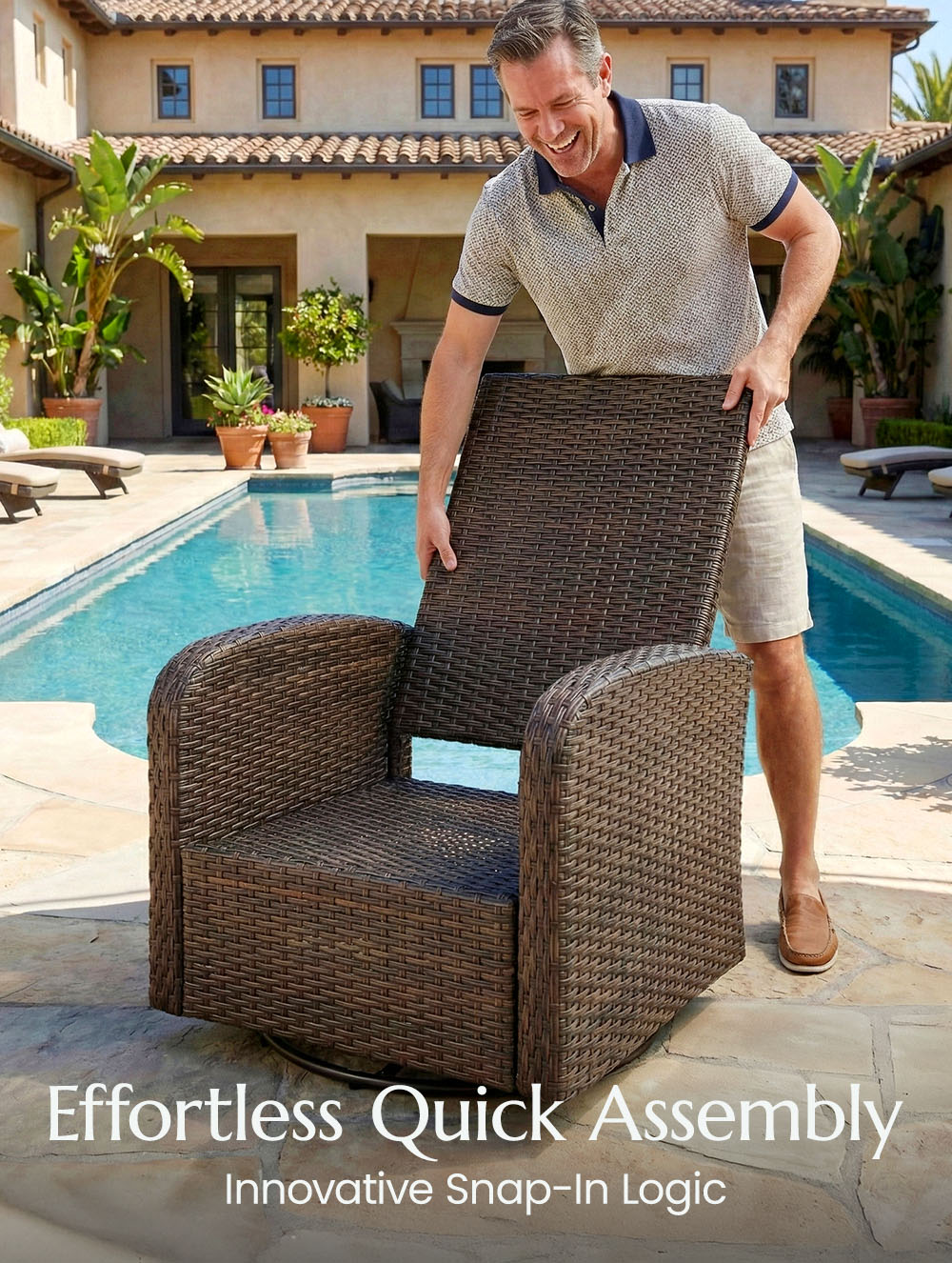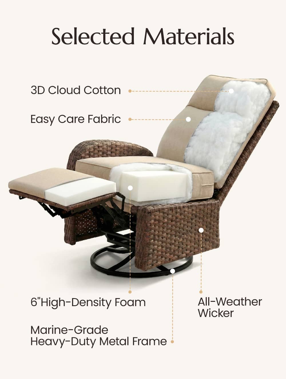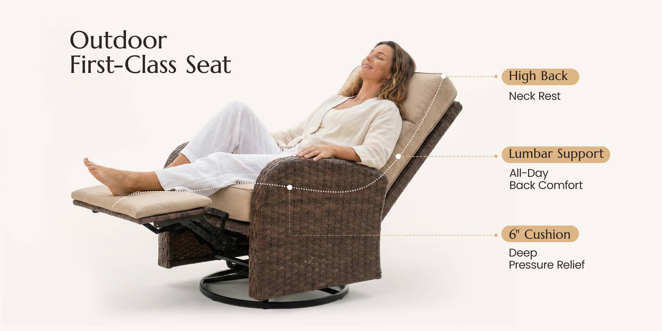 🔄3-in-1 Swivel, Glide & Recline: Experience the ultimate outdoor retreat with our signature "Swivel, Glide & Recline" technology. Whether you want to turn 360° to join a conversation, enjoy a gentle rhythmic glide, or fully recline for a nap, this chair adapts to your every mood.