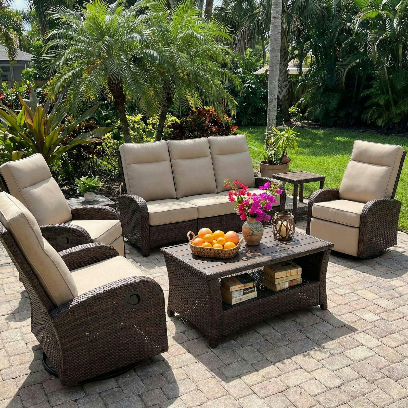 💦Durable & Easy Maintenance: Built for the elements with a marine-grade rustproof metal frame and hand-woven, UV-protected wicker. The stain-resistant fabric is designed to withstand pets and harsh weather, while all cushion covers are removable for effortless cleaning.