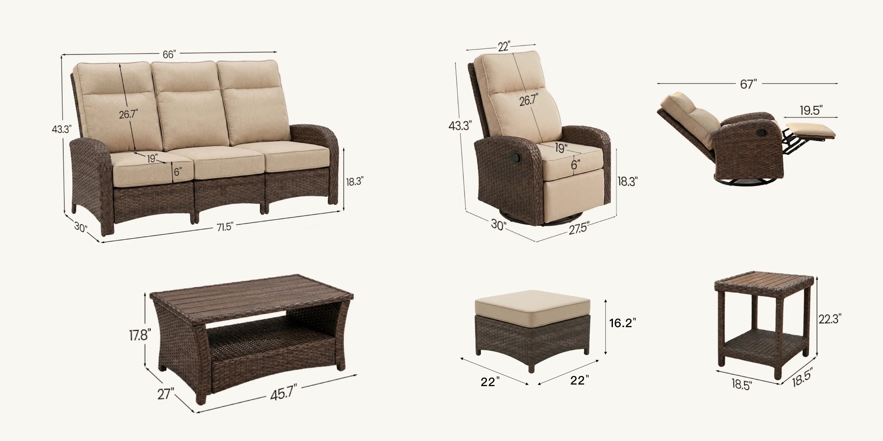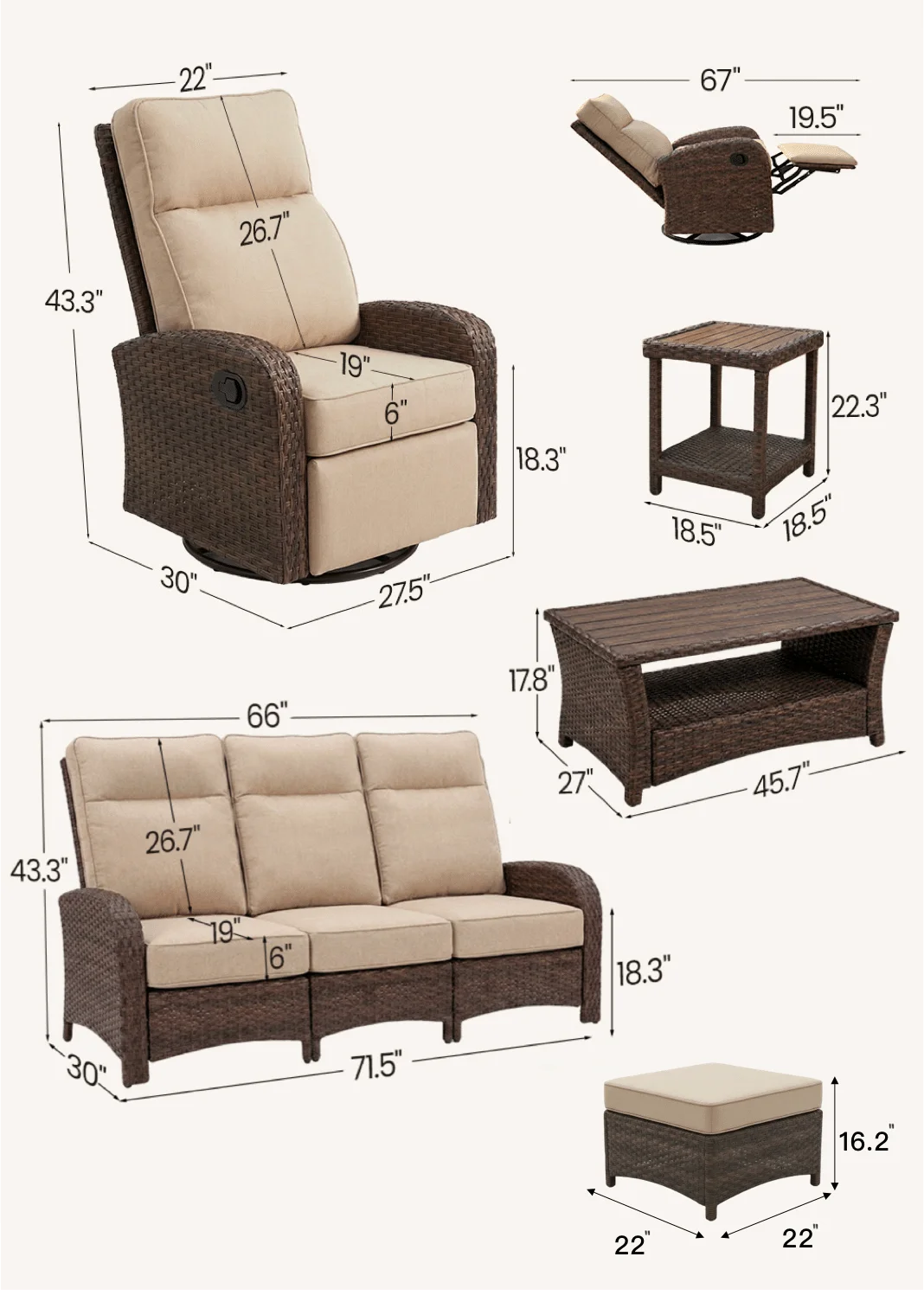 7PC Patio Wicker Swivel Glider Recliners Sofa Set, with Coffee Table and Side Table, Beige